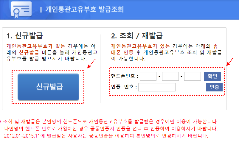 신규발급은 왼쪽 버튼, 조회 및 재발급은 오른쪽에서 핸드폰 번호와 인증번호를 인증한 후 확인하시면 됩니다.